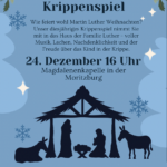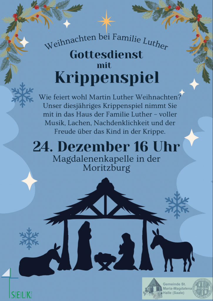 ![]() | 24.12.2025 Halle | Gottesdienst mit Krippenspiel „Weihnachten bei Familie Luther“ Wie feiert wohl Martin Luther Weihnachten? Unser diesjähriges Krippenspiel nimmt Sie mit in das Haus der Familie Luther – voller Musik, Lachen, Nachdenklichkeit und der Freude über das Kind in der Krippe. Sie sind herzlich eingeladen am 24. Dezember um 16 Uhr in die Magdalenenkapelle auf der Moritzburg. | Plakat zum Krippenspiel: 2025-12-24_Plakat_Krippenspiel |